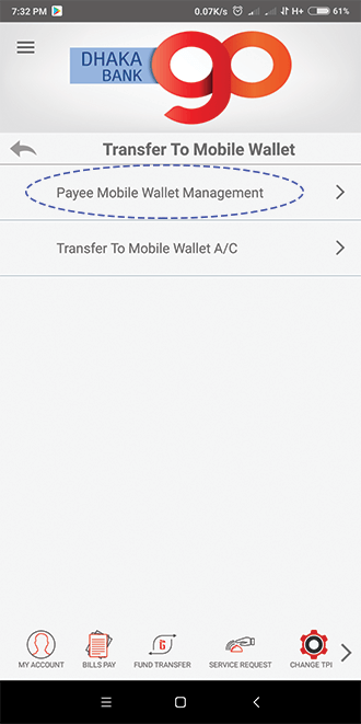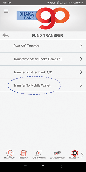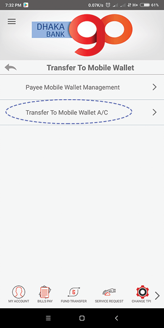 Step 8: Now you can go back to Fund Transfer again and select 'Transfer to Mobile Wallet A/c' to make a transfer money to bKash account(s) which you have added.