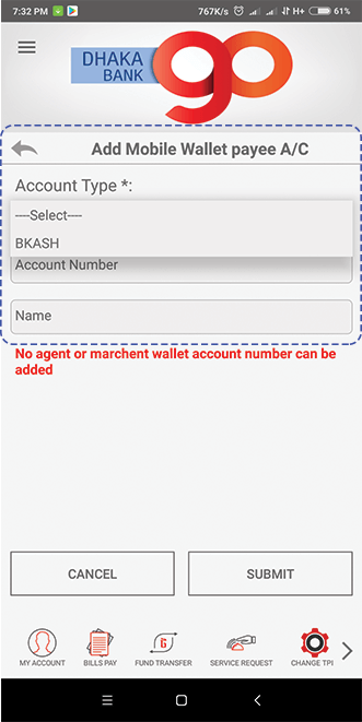 By tapping the SUBMIT button, you can successfully add a bKash account.