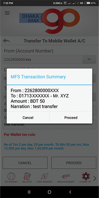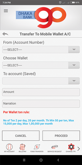 Step 9: Select From Account Number (i.e. Dhaka Bank A/c) and To Account (bKash Account) and specify the amount and write a narration for your future reference. Upon this, you need to tap PROCEED to transfer money.
