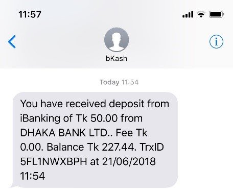 Yes, the bKash account holder will receive SMS notification from bKash. A sample SMS is shown below: