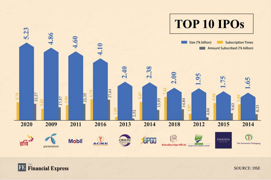 Some big companies would go public as few of those were waiting for necessary approval and others taking preparation. Presently, a good number of companies such as Rupali Bank, Union Bank, NRB Global, and Omera Petroleum were in the pipeline.The capital market experts have also stressed on listing more large companies having good fundamentals to deepen the country’s capital market and prevent rumour-based speculations and manipulation. Bringing such companies would also help attract foreign portfolio investors who show hardly any interest in small-cap companies. The experts, however, pointed out that the capital market of the country lacks adequate number of companies like Robi, which recently completed its public subscription to raise Tk 5.23 billion, for creating a strong base. The market has only six such companies having market capitalisation of billions of dollars. The companies are: Grameenphone, Walton Hi-Tech Industries, British American Tobacco Bangladesh Company (BATBC), Square Pharmaceuticals, United Power Generation and Distribution Company (UPGDC), and Renata. Apart from Robi, the list of top 10 IPOs included Grameenphone, MJL Bangladesh, The Acme Lab, Orion Pharma, the UPGDC, Bashundhara Paper Mills, Unique Hotel, Shasha Denims and The Peninsula Chittagong. These companies floated IPOs worth ranging from Tk 1.65 billion to Tk 4.86 billion during last 15 years from 2003 to 2018. Managing Director of IDLC Investments Limited Md. Moniruzzaman said the large-cap companies especially the multinational companies (MNCs) have the capability to compete in the local and international market. The market capitalisation of Grameenphone is US$ 5.07 billion, Walton Hi-Tech Industries US$ 2.88 billion, the BATBC US$ 2.25 billion, Square Pharmaceuticals US$ 1.86 billion, and the UPGDC US$ 1.66 billion as on Sunday. The market capitalisation of Renata was US$ 1.23 billion on Thursday last.