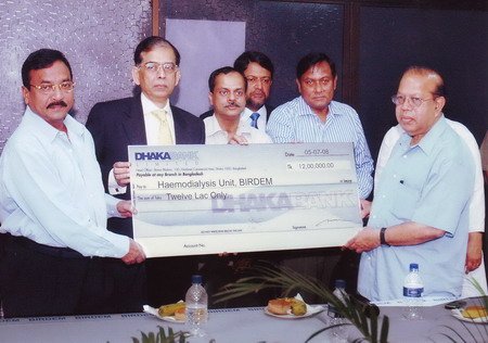 As a part of the corporate social responsibility Dhaka Bank Foundation has provided Taka 1.2 Million as donation in the year 2007 to Bangladesh Institute of Research and Rehabilitation in Diabetes, Endocrine & Metabolic Disorders (BIRDEM) as a gesture of humanitarian consideration for the dialysis treatment of the financially needy persons. Mr. Mohammed Hanif, Vice Chairman, Dhaka Bank Limited formally handed over this donation to Professor A. K. Azad Khan, President, Diabetic Association of Bangladesh on July 8, 2008 at BIRDEM Conference Center.