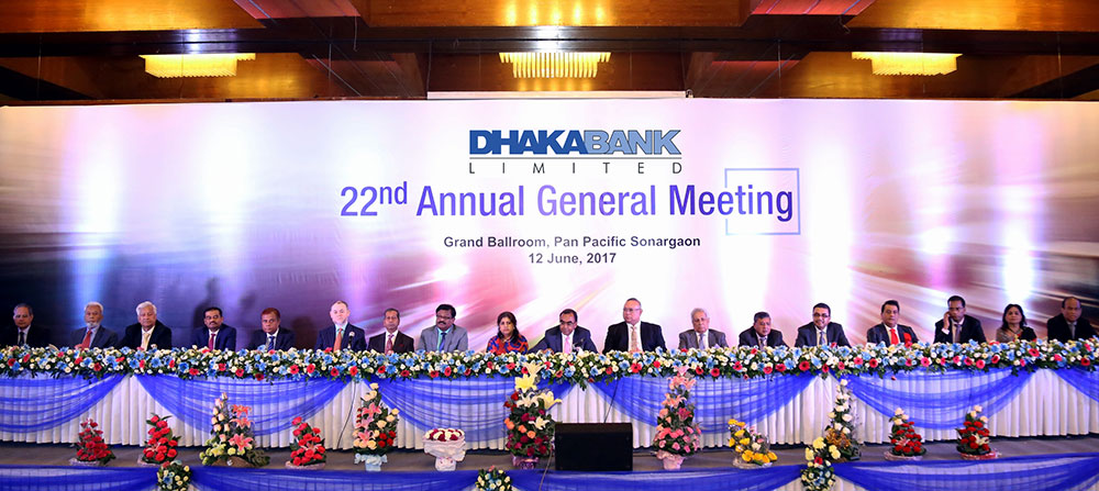 22nd Annual General Meeting of Dhaka Bank Limited was held on 12th June, 2017 at Grand Ball Room, Pan Pacific Sonargaon, Dhaka. Mr. Reshadur Rahman, Chairman presided over the meeting. 10% Cash and 5% Stock Dividend have been declared as the dividend for the year 2016. Among others, Vice Chairperson Mrs. Rokshana Zaman, Founder and Former Advisor Mr. Mirza Abbas Uddin Ahmed, Former Vice-Chairperson & Sponsor Shareholder Mrs. Afroza Abbas, Founder Chairman & Director Mr. Abdul Hai Sarker, Former Chairman Mr. A T M Hayatuzzaman Khan, Directors messrs. Altaf Hossain Sarker, Md. Amirullah, Abdullah Al Ahsan, Tahidul Hossain Chowdhury, Jashim Uddin, Khondoker Monir Uddin, Khondoker Jamil Uddin, Amanullah Sarker, M.N.H.Bulu, Independent Director Mr. Syed Abu Naser Bukhtear Ahmed and Mr. M. A. Yussouf Khan, Former Directors Mr. Khandaker Mohammad Shahjahan, Mrs. Rakhi Das Gupta and Managing Director & CEO Mr. Syed Mahbubur Rahman were also present. Apart from them, Additional Managing Director Mr. Emranul Huq and Deputy Managing Directors Mr. Khan Shahadat Hossain, Mr. Shakir Amin Chowdhury, Mr. Mohammad Abu Jafar, Company Secretary Mr. Arham Masudul Huq and a good number of Shareholders were also present on the occasion.