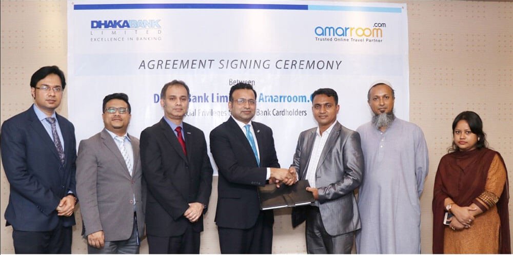 The agreement signing ceremony took place at the Retail Business office of the bank located in Dhanmondi, Dhaka. H.M. Mostafizur Rahaman, SVP & Head of Cards, of Dhaka Bank and Imrul Hasan, Director and CEO of amarroom.com signed the agreement on behalf of their respective organisations. Among others, from Dhaka Bank Limited Mr. Shafquat Hossain, SEVP & Head of Retail Business, Mr. Tahsin Taher, FVP and from amarroom.com Mr. Kamrul Islam Manager along with other officials of both the organizations were also present in the agreement signing programme.