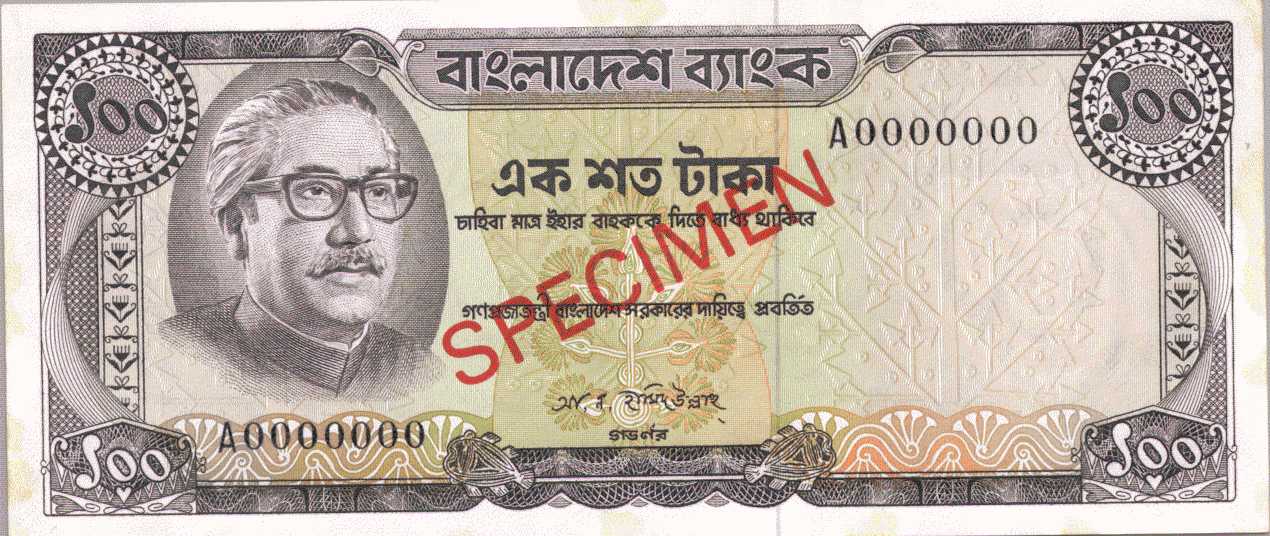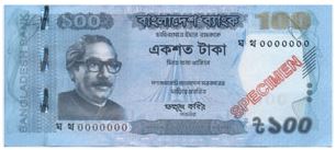 Obverse - Portrait of Sheikh Mujibur Rahman and the map of Bangladesh .