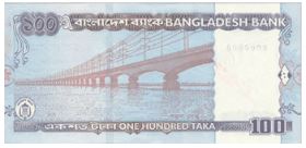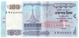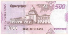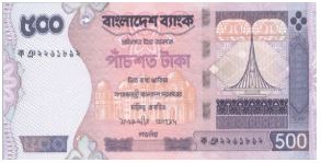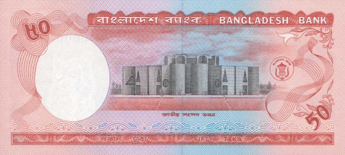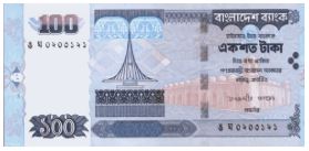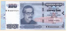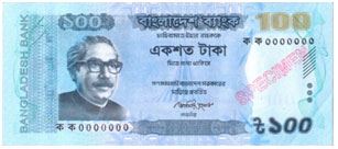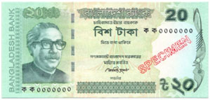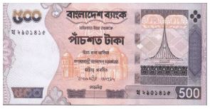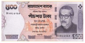 Obverse - Portrait of Bangabandhu Sheikh Muzibur Rahman, the Father of the Nation. The picture of National Monument is printed in light color in the middle of the front side of the note.