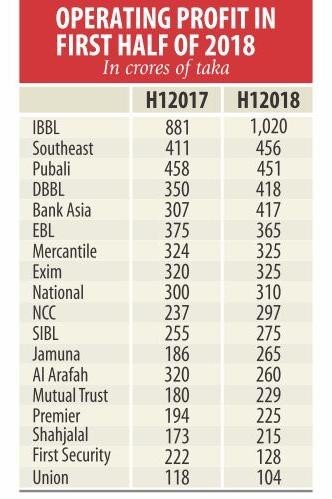 Most of the private banks registered higher operating profits in the first half of the year in spite of a number of challenges, including liquidity crisis and interest rate hike. 18 banks’ operating profits; 14 posted growth in operating profits ranging from 5 percent to 36 percent. Private sector credit growth maintained a satisfactory trend in recent months, which allowed banks to log in a handsome amount of operating profit, he said. Another reason for the rise in operating profits is the acceleration of implementation of mega infrastructural projects. From July 1, banks have started to lower the interest rates to single digits on loans and deposits in line with the decision of the Bangladesh Association of Banks, a forum of bank directors. Banks will have to bring down the interest rates for lending and deposit to 9 percent and 6 percent respectively, meaning that the interest spread will come down to 3 percent from the 5 percent limit set by the central bank. The rising operating profit is not the true picture of the banking sector, said managing director of Dhaka Bank. The actual profit figures would change significantly after accounting for provisioning and tax, said Rahman, also the chairman of the Association of Bankers, Bangladesh.
