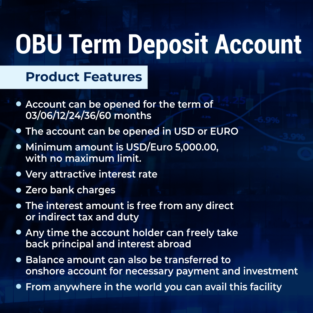 For OBU Term Deposit Account, a linked FC (Current Account/Savings Account) is necessary to facilitate the operation. If already have such account with Dhaka Bank OBU, for opening Term Deposit account, only filled in Term Deposit Account opening form will be suffice along with documents required for nominee (if applicable).