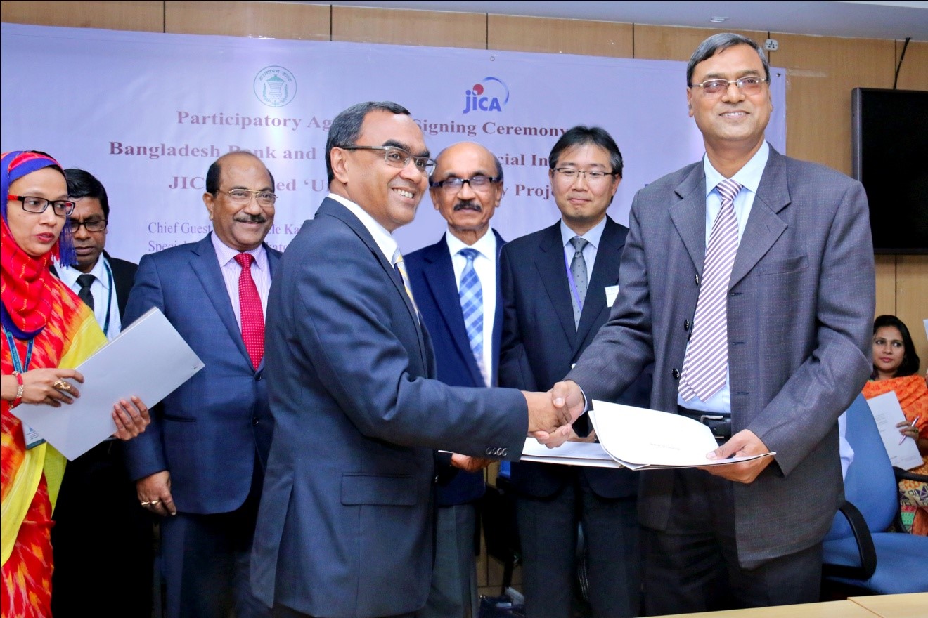 Syed Mahbubur Rahman, Managing Director and CEO of Dhaka Bank Ltd. and Swapan Kumar Roy, General Manager, SMESPD, Bangladesh Bank signed a Participating Financial Institutions (PFI) Agreement under JICA assisted Urban Building Safety Project (UBSP) Monday 13.02.2017 at the Bangladesh Bank Head Office. Among others, Governor of Bangladesh Bank Fazle kabir, Deputy Governor S. K. Sur Chowdhury, Chief Representative of JICA Bangladesh Office Takatoshi Nishikata and Deputy Managing Director (International Business) of Dhaka Bank Limited Mohammad Abu Jafar were also present on the occasion.
